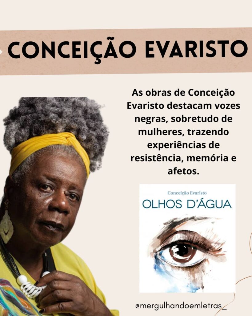 Conceição Evaristo (1946– atual) é uma das maiores autoras contemporâneas do Brasil. Mineira, cresceu em contexto de pobreza e começou a escrever influenciada pelas histórias de mulheres negras de sua família e comunidade.