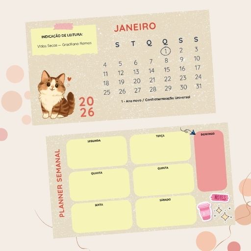 Além da visualização completa dos meses, o material conta com páginas de planejamento mensal e semanal, datas comemorativas importantes e indicações de leitura mensal, trazendo a literatura para o centro da sua rotina CALENDÁRIO MENSAL – 2026.