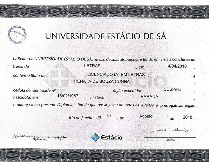 • Só apaguei na foto acima o número do meu documento, um código em vermelho embaixo do selo da Estácio e a minha assinatura.